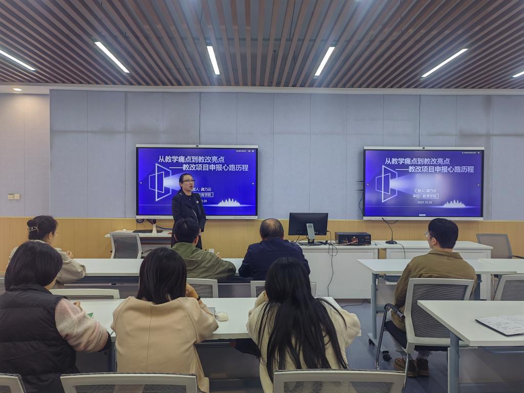 教育学院龚乃云老师在汇报中结合教改项目《基于具身化体验的“三大精神”融入师范生舞蹈类课程思政育人模式研究》的申报过程,详细介绍了教改项目定位、选题、申报的方法与策略。她特别提到,教师必须聚焦教学一线现场,正视教学中的核心难点与痛点,紧扣问题导向与政策契合度,精准提炼出项目的理论创新、实践创新与方法创新。