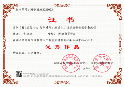 湖北省高等院校教师人工智能应用案例征集活动评选结果于近日揭晓。我校艺术与传媒学院袁婧婧老师申报的案例《虚实双轨智训升维:AI虚拟工坊赋能影像教学全流程》以其鲜明的创新性和突出的实践成效脱颖而出,被评为省级优秀案例,并获推荐参与教育部教育技术与资源发展中心组织开展的全国教师人工智能应用案例征集活动。
